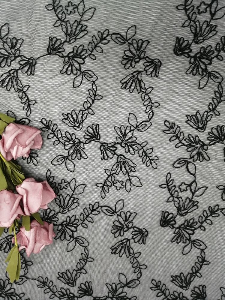 Η μαύρη σχοινόδετη κεντητική λουλουδιών δένει παντού τις ασημένιες προδιαγραφές πλέγματος του Tulle υφάσματος: