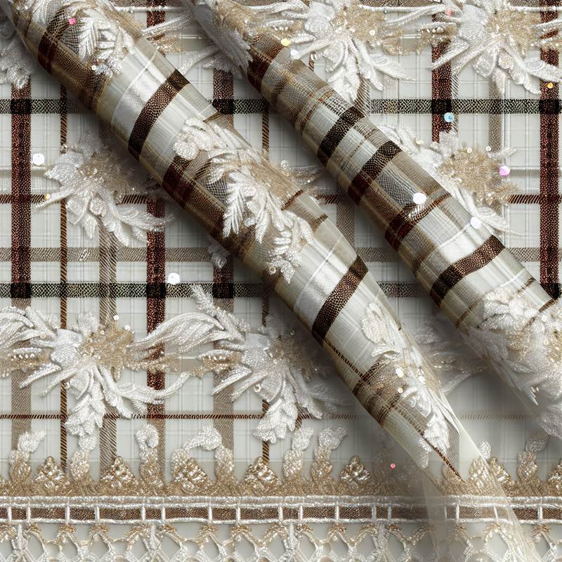 Το δαντελένιο κεντημένο ύφασμα με λεπτά μοτίβα φύλλων είναι μια δημοφιλής επιλογή για νυφικά και βραδινά φορέματα, προσφέροντας κομψότητα, υφή και περίπλοκες λεπτομέρειες. Η τεχνολογία πίσω από την παραγωγή του περιλαμβάνει ένα μείγμα παραδοσιακής χειροτεχνίας και σύγχρονων υφαντικών καινοτομιών.
